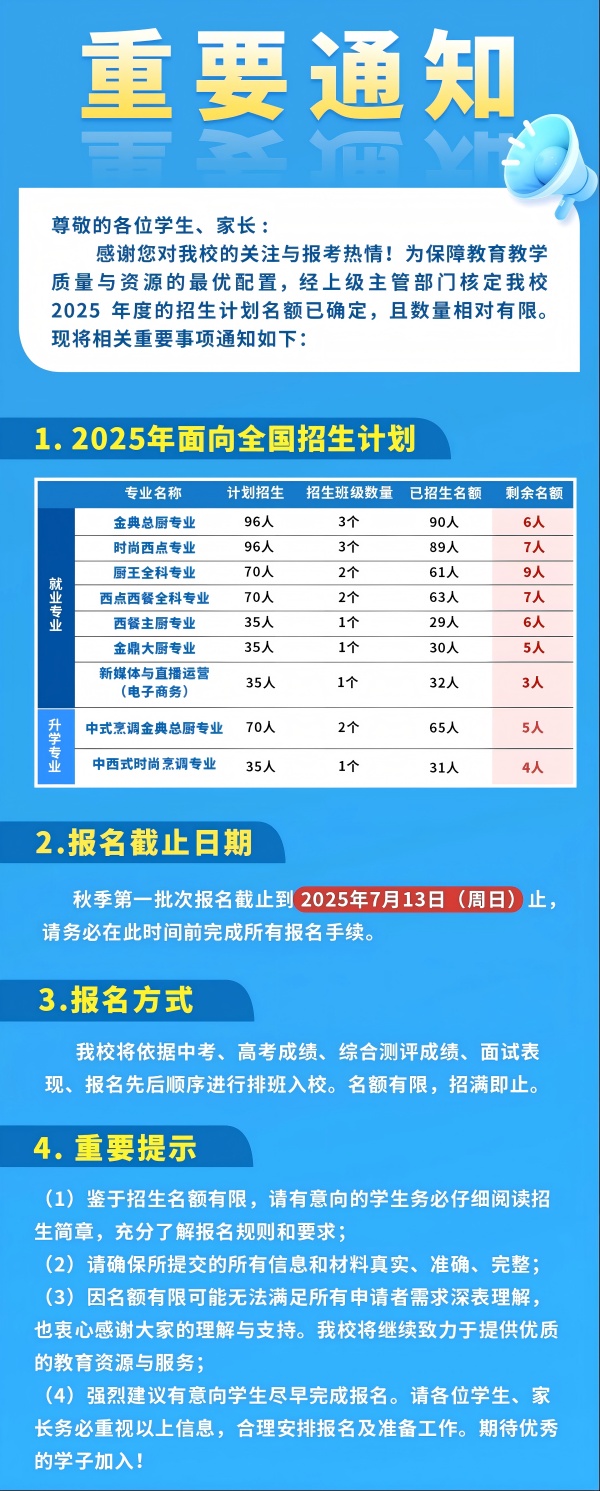 速搶?zhuān)『贾菪聳|方烹飪學(xué)校2025年秋季第一批次報(bào)名即將截止